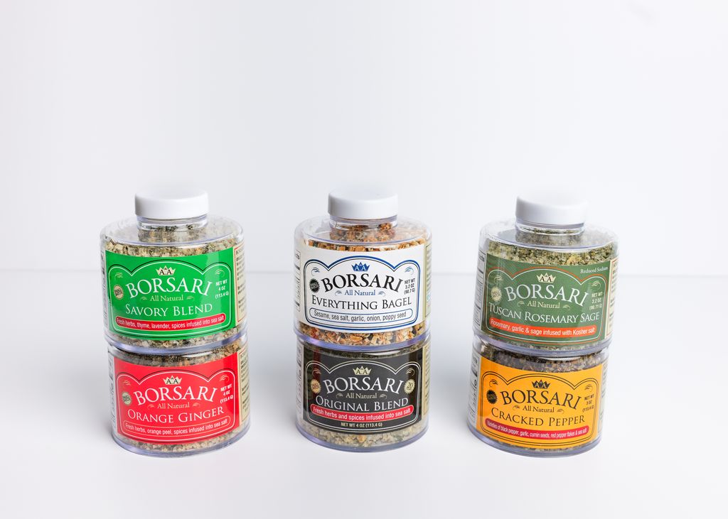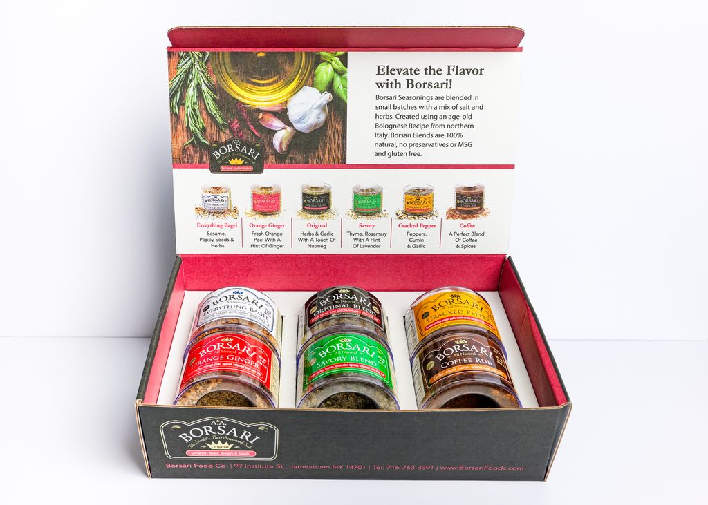 The Borsari Gourmet Seasoning Gift Box is the perfect gift for any occasion. Each Gift Box includes six gourmet blends: Everything Bagel, Orange Ginger, Original, Savory, Cracked Pepper, and our newest blend, Tuscan Rosemary Sage. Borsari Seasonings use only the freshest ingredients that pair nicely with meat, seafood, poultry, and vegetables.